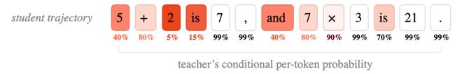 实践中,采样序列能提供对教师分布的无偏估计,并达到相同的目标。学生模型会根据自身生成序列中各个 Token 的概率大小进行更新:它自己越不可能生成某个 Token,那么朝这个 Token 更新的幅度就越大。在下方案例中,更新幅度由颜色的深浅表示: