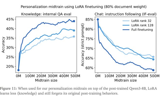 当把 LoRA 应用于已完成后训练的 Qwen3-8B 模型,进行个性化中期训练时,它不仅学到的知识更少,而且仍然会忘记原有的后训练行为。