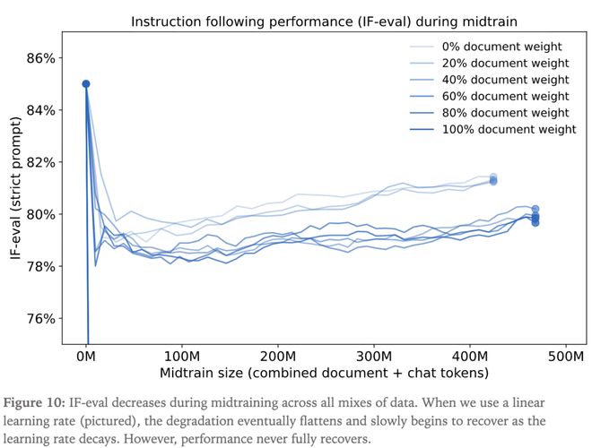 在所有数据混合比例下,IF-eval 的分数在中期训练期间都会下降。当使用线性学习率(如上图所示)时,性能下降最终会趋于平缓,并随着学习率的衰减而缓慢开始恢复。然而,性能从未完全恢复。