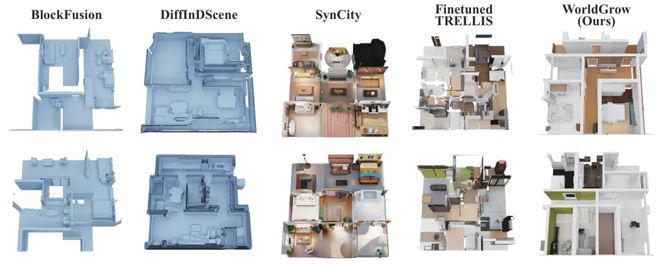 对比可以看出,WorldGrow 能够生成高分辨率、连续的室内场景,且场景具有真实且连贯的纹理。