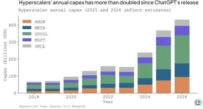 有报道称,2026 至 2027 年间,美国企业在 AI 基础设施上的支出预计将突破 5000 亿美元。