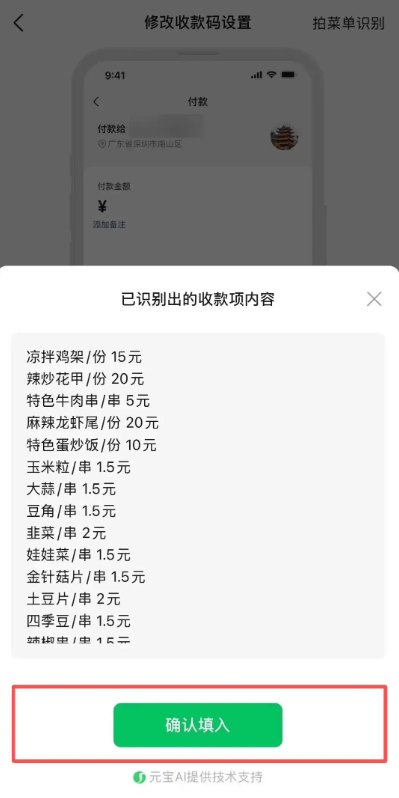 微信右上角点击 “收付款 - 二维码收款”,打开 “经营收款码” 再点击 “收款码下单模式设置 - 拍菜单识别”,选择拍照或相册上传。不用挨个手动录入菜品和金额,“在线化菜单” 秒生成。元宝识别出的菜单还可以直接变成收款时顾客付款可选的付款项。此外,用户下单时,还能在付款的同时备注名称、联系方式和特殊需求。