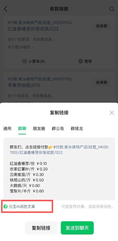 社群带货的老板们,还可使用社群文案功能,打开 “收款链接 - 复制链接”,选择发送到聊天,就能选用 “元宝 AI 润色文案”,还能选择不同宣传对象和语言风格,生成专属带货文案。