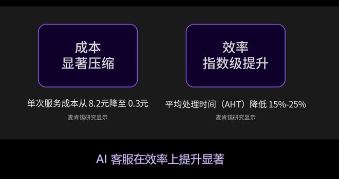 在成本和效率上,AI客服终于活出了人样:单次服务成本降低至 0.3 元;平均处理时间降低了 15%-25%。