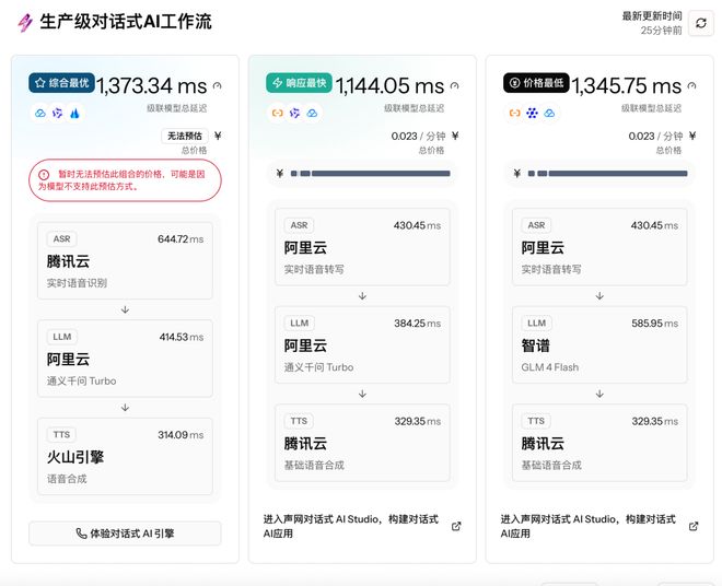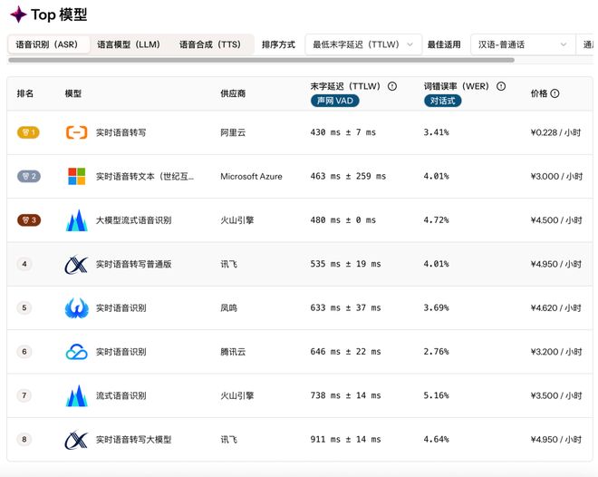 对话式 AI 模型评测平台 3.0 则是在提供横向评测 ASR、LLM、TTS 各类主流模型的延迟响应、词错误率、字母数字性能的基础上,