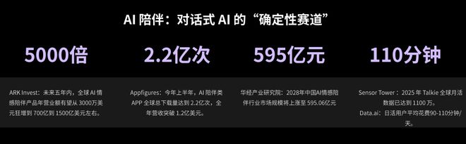 比如,方舟投资(ARK Invest)的报告显示,AI 陪伴赛道有机会暴涨 5000 倍,从 3000 万美元上涨到 700-1500 亿美元。