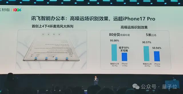 讯飞智能办公本 X5 首创上 4 下 4 环的八麦克风阵列,能够 360 度声源定位,高噪远场识别效果遥遥领先 iPhone 17 Pro。