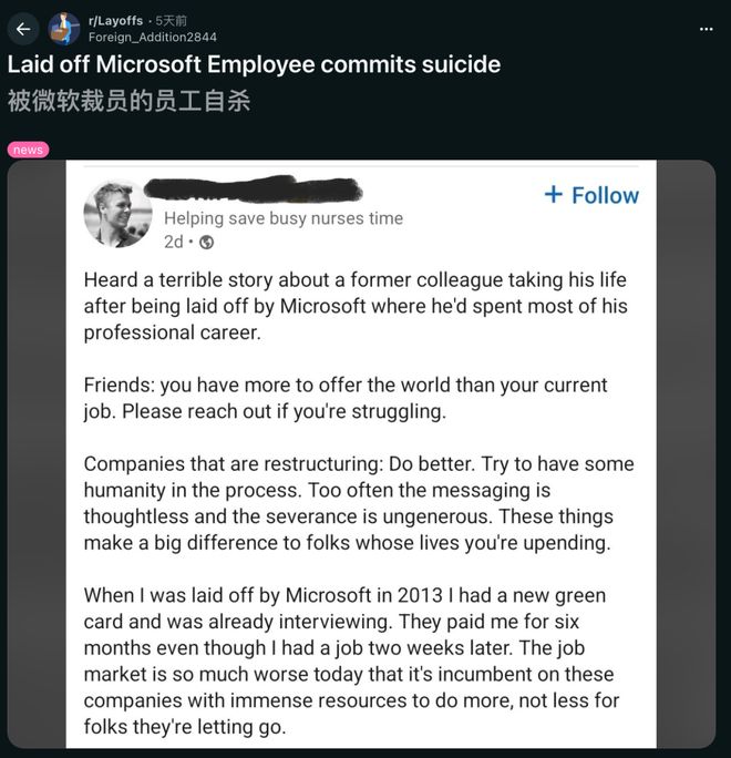 悲剧的是,有人被微软裁员后,甚至结束了自己的生命。爆料网友称,微软曾是他奉献大半职业生涯的地方。