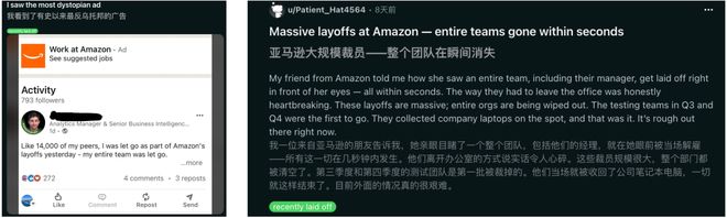 更讽刺的是,亚马逊在官宣 14000 人大裁员的同时,被裁员工领英帖子上方,还有一个招聘广告。
