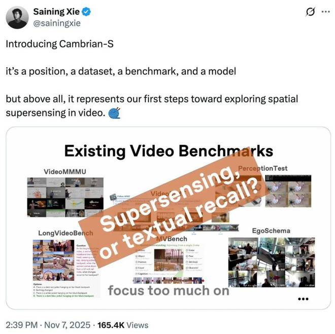 这次的成果名为「Cambrian-S」,根据谢赛宁的说法,它既是一种观点,也是一个数据集、一个基准或者一个模型,代表其迈出了探索视频空间超感知的第一步。