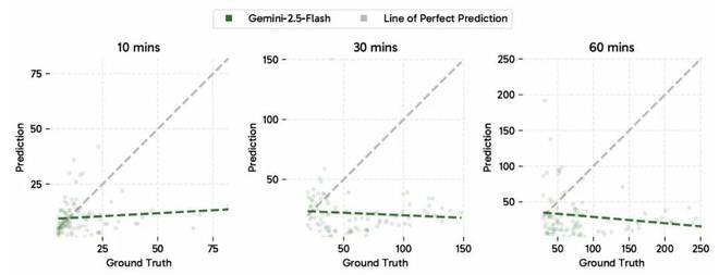 然而,即使是在其上下文窗口之内的 60 分钟 VSI-SUPER 视频上,VSR 和 VSC 的性能仍然有限 —— 分别只有 41.5 和 10.9。如图 6 所示,模型预测的物体计数未能随视频长度或物体的真实数量而扩展,而是饱和在一个很小的恒定值,这表明其在计数能力上缺乏泛化性,并依赖于训练分布的先验。
