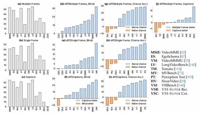 使用文本字幕代替视觉输入也产生了显著的性能提升,在 EgoSchema、VideoMME、LongVideoBench、VideoMMMU、Perception Test 和 MVBench 等基准上,其准确率超过随机水平 20% 以上(图 2 i)。在将基准性能与「盲测」结果进行比较时,也可以得出类似的结论(图 2 d, f)。这种性能表现意味着,这些基准主要探测的是可从视频内容的文本摘要中推断出的能力。