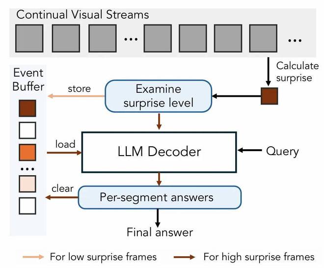 研究者提出将预测性感知作为一种前进的路径,即模型学习预测其感知输入,并构建内部世界模型来处理无界的视觉流。这一设计受到了人类认知理论的启发。与当前标记化并处理整个数据流的视频多模态模型不同,人类的感知(和记忆)具有高度选择性,只保留一小部分感知输入。大脑不断更新内部模型以预测传入的刺激,压缩或丢弃那些不贡献新信息的、可预测的输入。相反,违背预测的意外感知信息会产生「惊讶度」,并驱动注意力和记忆编码的增强。