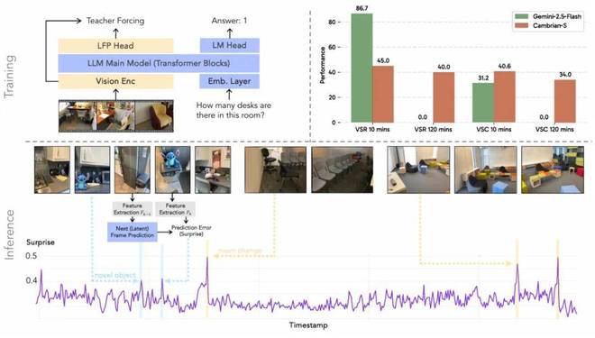 团队尝试了一种全新的原型 —— 预测感知(predictive sensing),在 Cambrian-S 上训练了一个潜变量帧预测(LFP)头。在推理过程中对「惊讶度」(surprise)进行估计,并以两种方式加以利用:1)surprise-driven 的记忆管理 —— 压缩或跳过不令人惊讶的帧,将算力集中在令人惊讶的帧上;surprise-driven 的事件分割 —— 利用惊讶值的峰值来检测事件边界或场景变化。