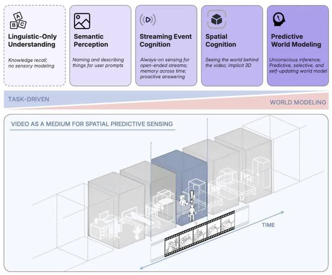 参照图 1,空间超感知要求 MLLM 具备四种关键能力:语义感知、流式事件认知、隐式 3D 空间认知和预测性世界建模