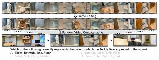 VSR 基准要求 MLLM 观察长时程的时空视频,并按顺序回忆出一个异常物体的位置。如图 4 所示,为了构建这个基准,人类标注者使用图像编辑模型(即 Gemini)将令人惊讶或不合时宜的物体(例如,一只泰迪熊)插入到一个室内环境的 walkthrough 视频的四个不同帧(和空间位置)中。