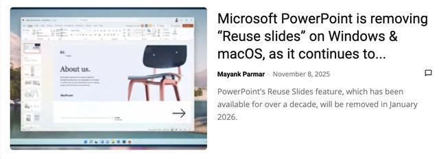 11 月 10 日消息,科技媒体 Windows Latest 发文透露,微软做出一项重要决策,计划于 2025 年 12 月逐步淘汰,并在 2026 年 1 月于 Windows 11、macOS 平台全面下线 PowerPoint 中的经典功能“重用幻灯片”(Reuse Slides)。