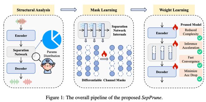 一篇提出了 SepPrune,专为深度语音分离模型构建结构化剪枝框架引入创新的「可微分掩码策略」,让模型通过梯度学习自动剔除冗余通道。