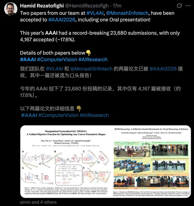 来自蒙纳士大学的副教授 Hamid Rezatofighi 称,团队也有三篇论文(1 Oral)被录用。