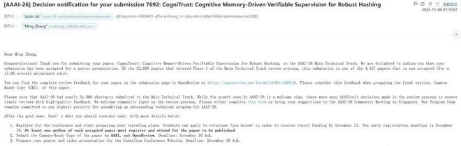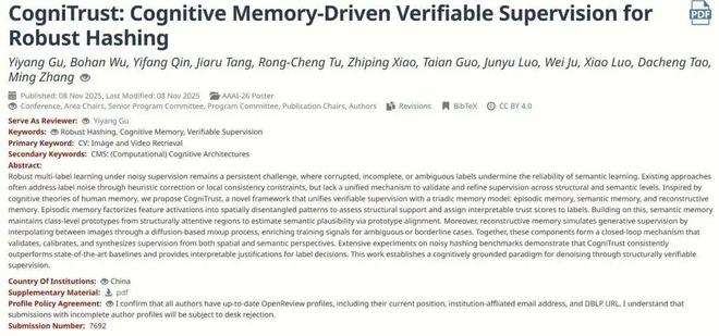 北大张铭教授组中,一位博五同学顾怿洋作为一作的论文被 AAAI 2026 录用,题为「CogniTrust:基于认知记忆的可验证监督的鲁棒散列方法」。