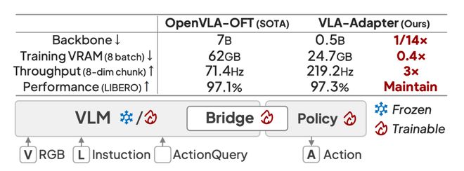 另外一篇,VLA-Adapter 作为已经破圈的轻量级 VLA 基座,在 GitHub 拿下 1.6k 个星。它仅需 0.5B 的小模型就在主流基准上(CALVIN、LIBERO)达到了 SOTA 性能。两篇工作均完全开源。
