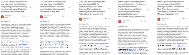 分别聚焦大模型隐私保护、安全对齐、多模态安全、自动驾驶鲁棒性、多智能体安全通信等方向。