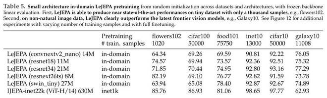 表 5 中的额外结果展示了 LeJEPA 即使在小至 1000 个样本的数据集上也能有效训练。