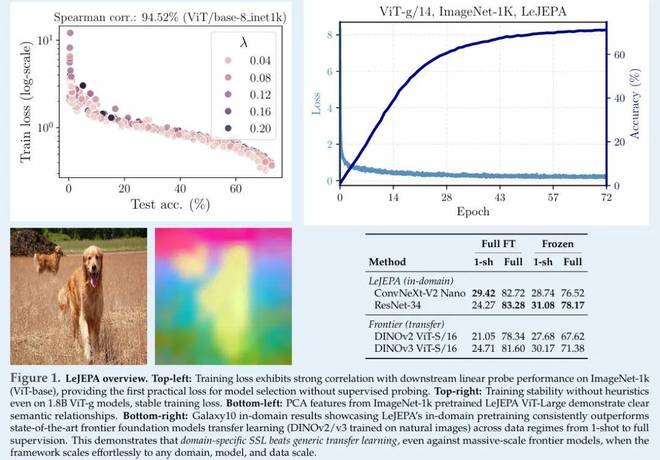 实验表明 LeJEPA:(i)在不同架构和数据集上都能可靠训练,(ii)为模型选择提供了信息丰富的训练损失,(iii)在小规模域内预训练上优于前沿视觉模型,(iv)在 ImageNet-1k 上成功扩展到近 10 亿参数,以及(v)无需显式监督即可学习丰富的语义分割特征。