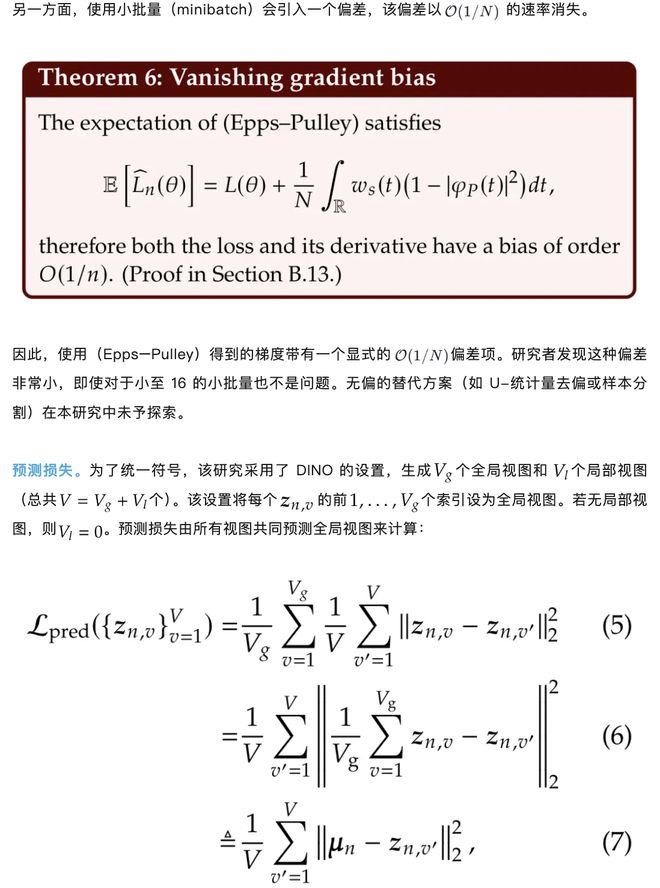 SIGReg 损失。研究者选择(Epps–Pulley)检验,因为它具有可证明的有界性(定理 4)和可扩展性。其实现基本遵循方程,只是积分部分使用了求积近似(一种数值估算方法)来进行估计。
