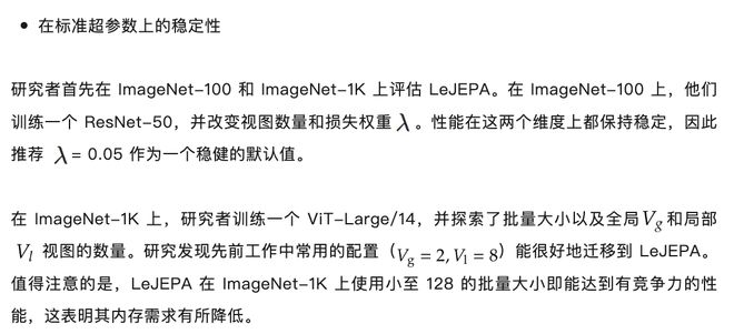 在迁移学习方面(表 2),该研究的基线是 IJEPA(ViT-Huge,6 亿参数)及其改进版 IJEPA + STOP。结果观察到,LeJEPA 尽管使用了更小的模型和更短的训练计划,其性能仍持续优于 IJEPA。