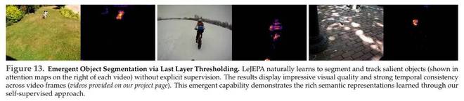 如图 13 所示,LeJEPA 的注意力以卓越的时间一致性自然地将前景物体与背景分割开来,这表明学习到的表示同时捕捉了空间语义和时间结构。这种涌现的能力表明,LeJEPA 注重稳定性的目标并没有牺牲所学特征的语义丰富性。