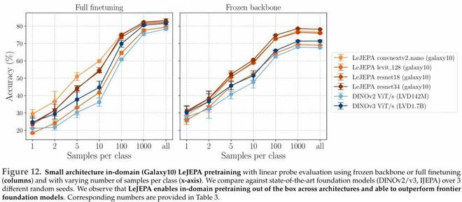 为了展示 LeJEPA 的多功能性,研究者建议直接在专业领域上进行预训练,而无需更改流程。研究者选择了 Galaxy10 数据集(一个星系形态分类任务)。该研究与最新的 DINOv2、DINOv3 和 IJEPA 进行了比较。