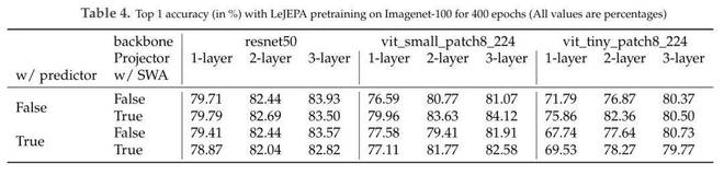 LeJEPA 的可证明构造使其能够移除许多传统上用于防止坍塌的启发式方法。先前的工作表明,预测器和教师-学生架构主要用于防止坍塌。得益于 LeJEPA 的 SIGReg 损失,该框架可以同时移除预测器和教师-学生架构,而不会遭受坍塌(如表 4 所示)。