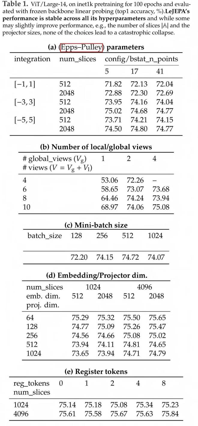 其次,最近的工作表明需要使用寄存器令牌来防止训练不稳定。表 1 的结果表明,这种不稳定性可能源于条件不良的训练目标。相反,LeJEPA 不需要寄存器令牌,无论有无它们都能实现稳定性能。