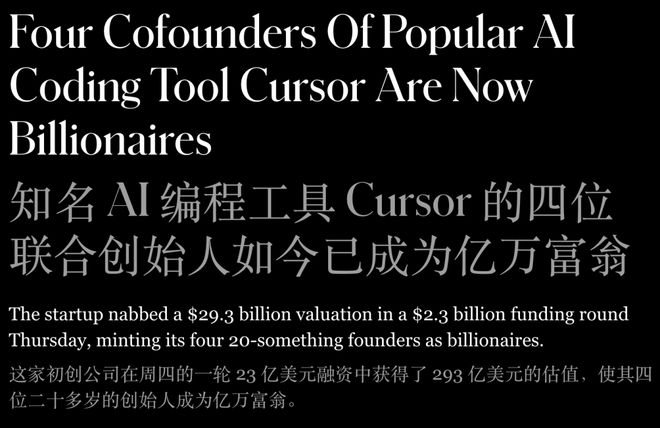 今天,全球爆火编程 AI 初创 Cursor 完成了 23 亿美金融资,估值直冲 300 亿美金。