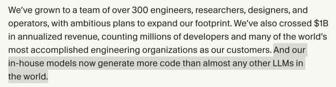 就代码生成量而言,Cursor 内部生成的代码,几乎超过全球所有其他 LLM 总和。