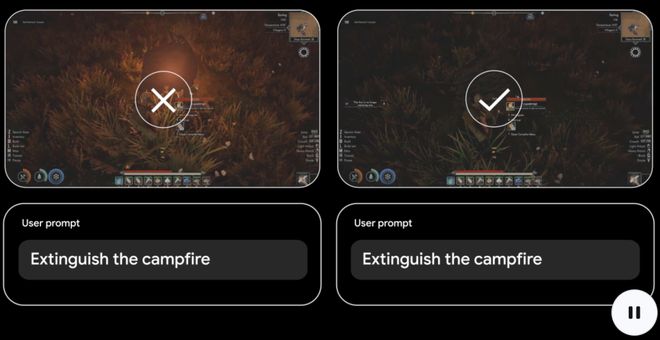 左侧展示的是初代 SIMA 2 智能体未能完成的任务示例。