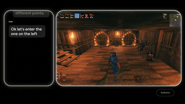 SIMA 2 现在可以在未经预训练的情况下攻克全新的游戏。(左边是 Gemini 的推理过程,右边是 SIMA 在操作游戏)