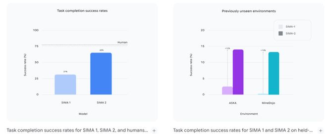 下面这个图展示 SIMA 2 相对 SIMA 1 能力的巨大提升。