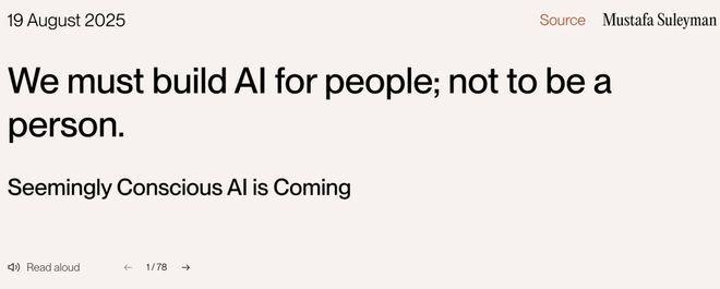 他今年 8 月的博客文章,标题是「我们必须为人构建 AI,而不是成为一个人」。