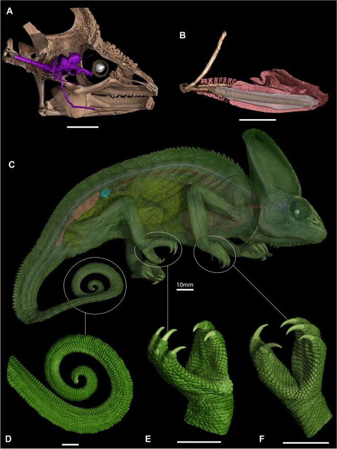 团队建立了 18 种蜥蜴的脑部 3D 模型,并测量其视神经长度和形态。结果显示,研究涉及的三种变色龙均拥有比其他蜥蜴显著更长、且呈螺旋状盘绕的视神经,与最初的观察一致。进一步对也门变色龙(Chamaeleo calyptratus)的三个胚胎阶段进行对比发现,视神经最初呈直线,随后在孵化前逐渐拉长并形成螺旋形态,新出生的个体即已具备完全灵活的双眼。