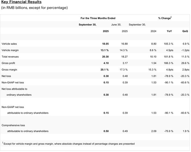 11 月 17 日,小鹏汽车(09868.HK;XPEV.US)披露 2025 年第三季度财报。财报显示,公司第三季度实现营收 203.8 亿元,同比增长 101.8%,环比增长 11.5%;归母净亏损为 3.8 亿元,同比收窄 78.9%,环比收窄 20.3%。