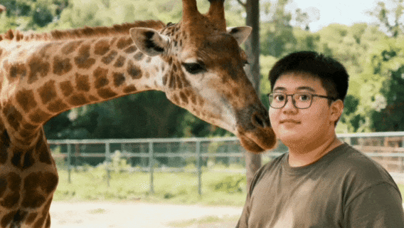 这是我喂给 Modify 的一张游客照,一个和长颈鹿合影的小男孩,因为拍摄角度的原因,男孩的眼睛显得有点小,皮肤也有些小瑕疵: