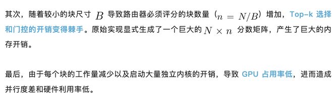 理论模型表明,较小的块尺寸能带来显著的质量提升,但朴素的 GPU 实现效率低下。由月之暗面发布的原始 MoBA 实现,在配置小块尺寸时会遭遇性能瓶颈,这些瓶颈抵消了稀疏性带来的计算节省,导致执行速度比稠密注意力更慢。