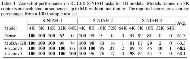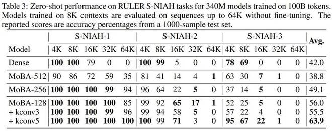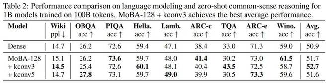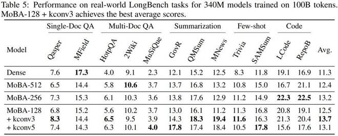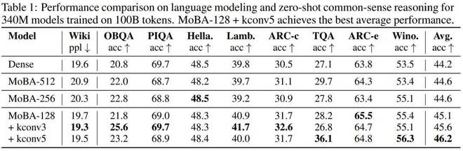 稀疏匹配密集注意力机制。在多个基准测试和规模下,MoBA 的表现与密集注意力机制相当甚至更胜一筹。