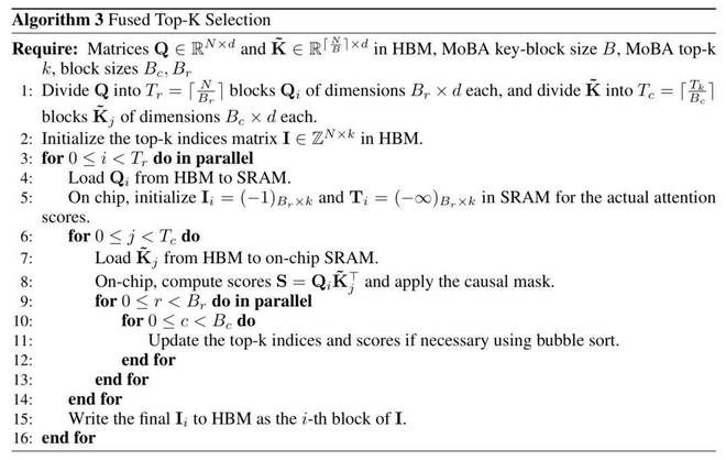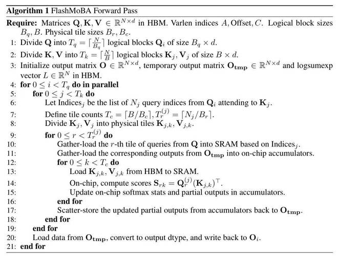 为了处理 MoBA 的不规则稀疏性,前向内核使用了一种基于两级分块机制的「收集并致密化」策略,详见算法 1。