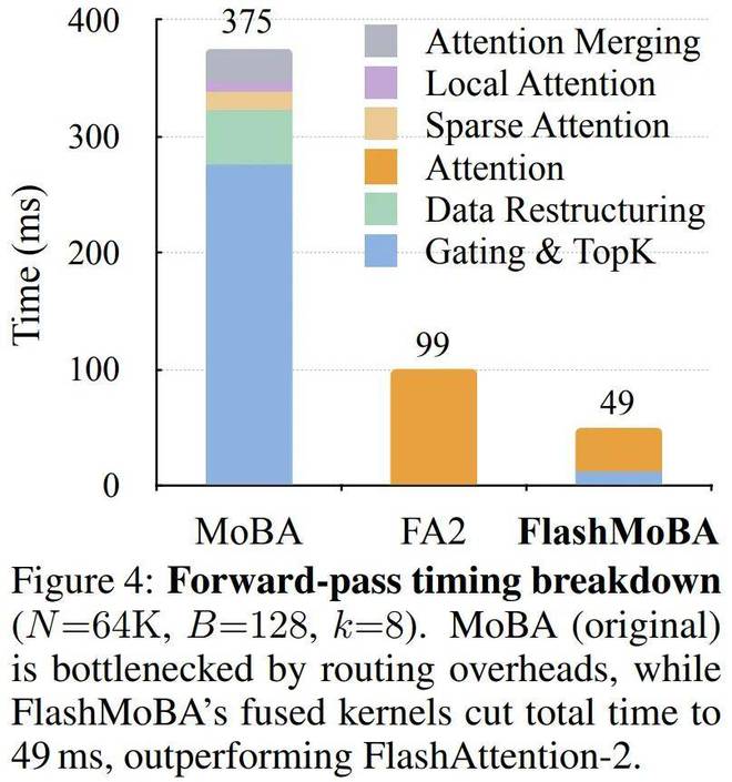 为了理解 FlashMoBA 的提速来源,图 4 展示了在 N=64K 下前向传播的耗时分布。