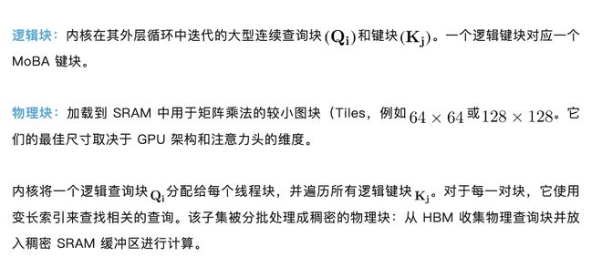 原始 MoBA 包含 5 个阶段:(1)计算质心并执行 top-k、(2)全局 reindex、(3)在路由后的索引上执行注意力、(4)局部因果注意力以及(5)合并结果。