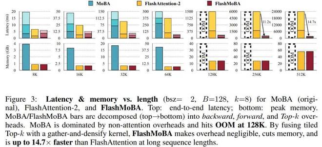 端到端性能。图 3 对比了不同序列长度(8K 至 512K token)下的延迟和内存占用。FlashMoBA 在两项指标上都显著优于原始实现。