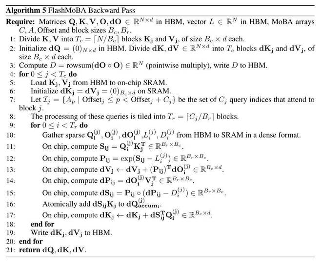 反向传播利用了 FlashAttention-2 的内存高效设计,并实现为三个内核的序列(算法 5)。